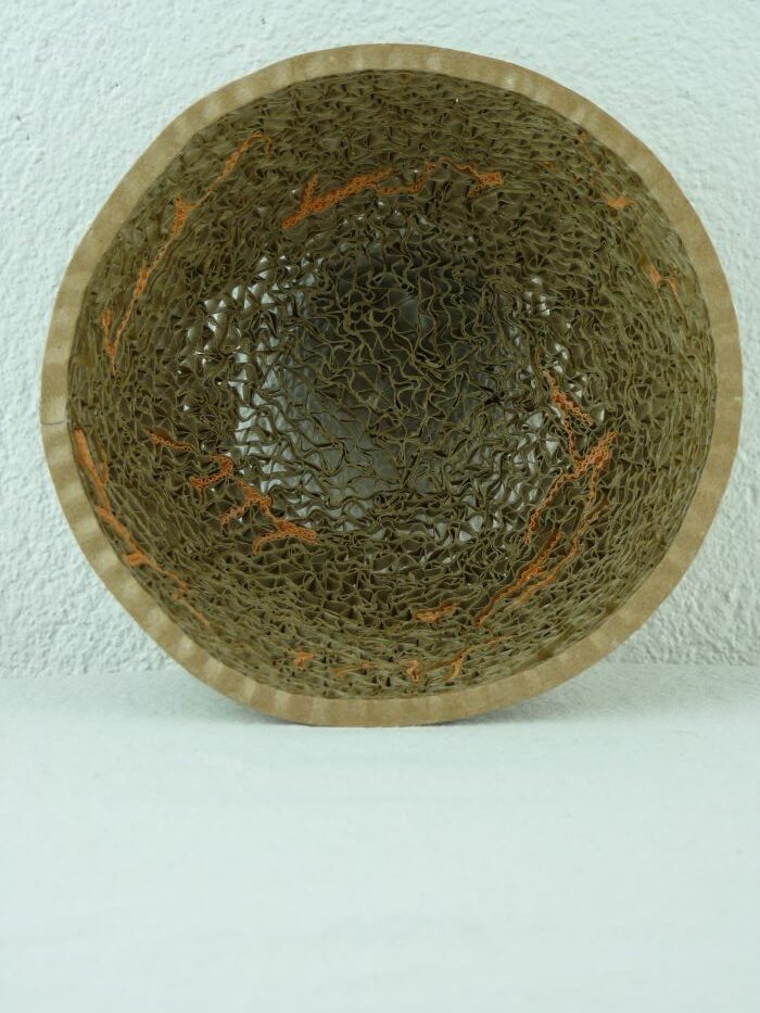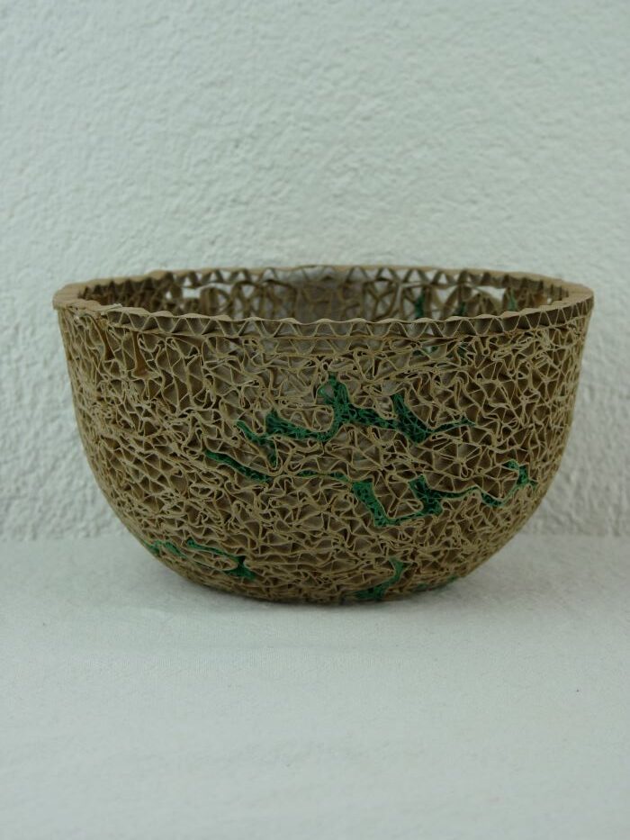 Der Karton als Recyclingmaterial ist die Quelle für viele Kreationen, darunter Bildrahmen und Schalen. Seine Form- und Farbgebung lassen zahlreiche und erstaunliche Interpretationen zu. Die Verwendung und das Spielen mit Wellen, Überlagerungen und Zusammensetzungen schaffen Wunderwerke… Pappe eignet sich für alles. Es kann roh oder mit Lack, Farbe und Beflockung bearbeitet werden und verwandelt sich in ein vollwertiges Baumaterial.
